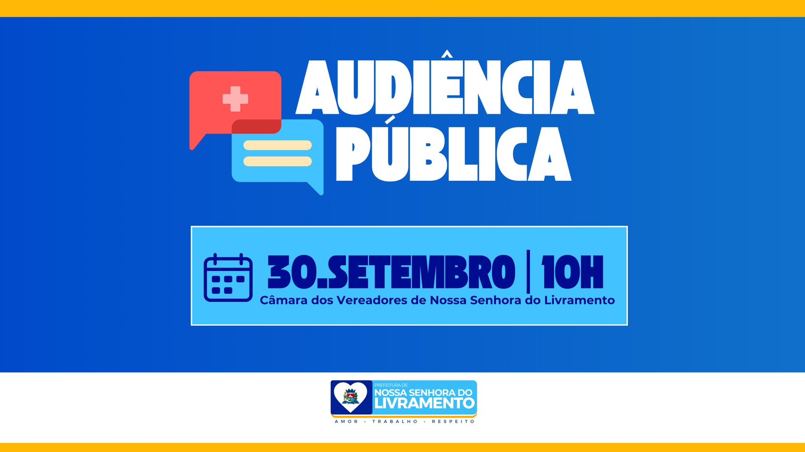 A Prefeitura Municipal de Nossa Senhora do Livramento publicou o Edital de Convocação nº 005/2025, convidando toda a população a participar da audiência pública para apresentação e discussão da Lei Orçamentária Anual (LOA) 2026. O encontro acontecerá no dia 30 de setembro de 2025 (terça-feira), às 10h da manhã, na Câmara Municipal, com transmissão também pelos meios eletrônicos oficiais.