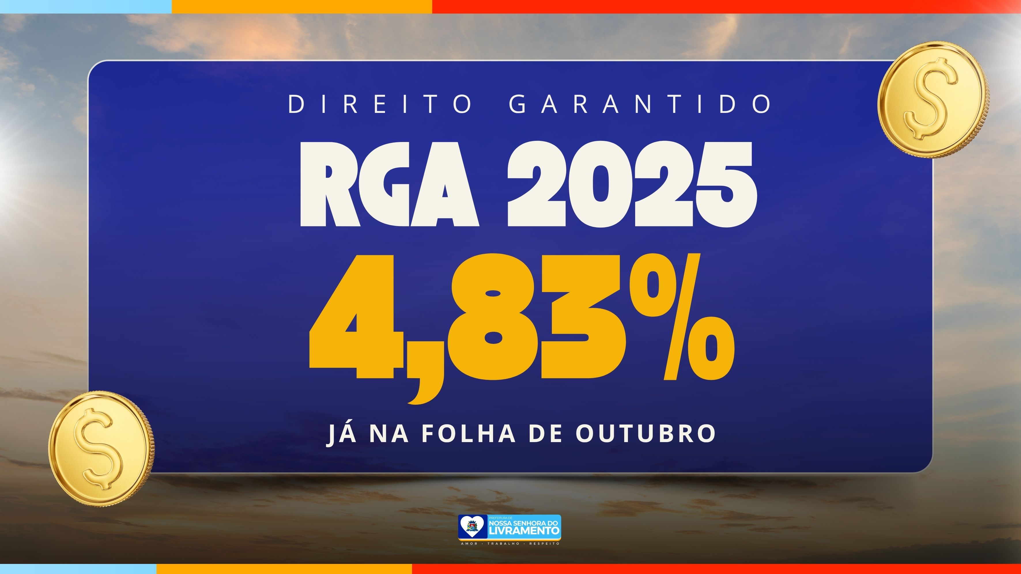 A Prefeitura de Nossa Senhora do Livramento anunciou, nesta semana, mais uma importante conquista para os servidores municipais. Ontem (1º de outubro), o prefeito Dr. Thiago Almeida assinou a liberação do pagamento referente ao Reajuste Geral Anual (RGA), no percentual de 4,83%, destinado aos funcionários estatutários da administração pública.